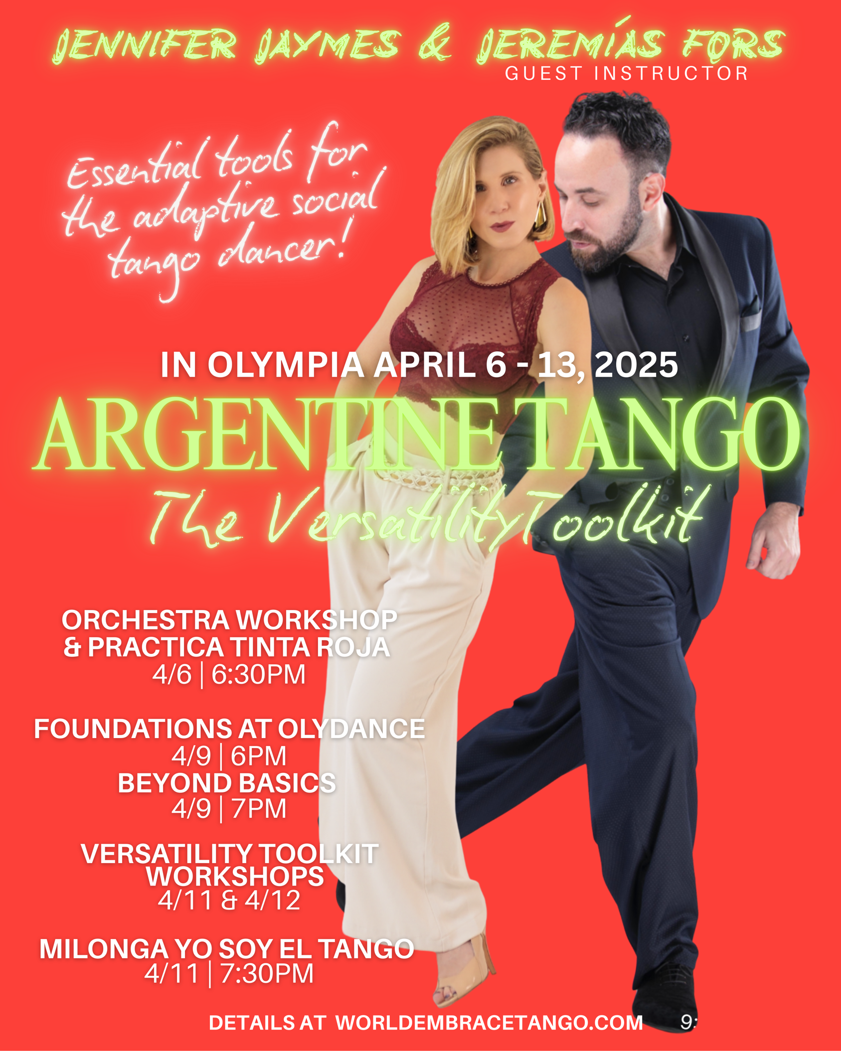 SATURDAY, APRIL 11TH Versatility Toolkit Workshops & Milonga Yo Soy El Tango 1:30-3pm Style is not a Sticking Point 3-3:30pm Break and Open Lab 3:30-5pm Dynamics, Contrast & Musical Play Olympia Eagles, 3rd floor